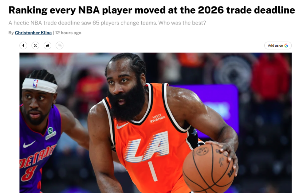 交易人数破NBA历史纪录!美媒排出截止日10大换队球星,哈登与祖巴茨两人携手杀入前5名,火箭队错失数个理想目标。